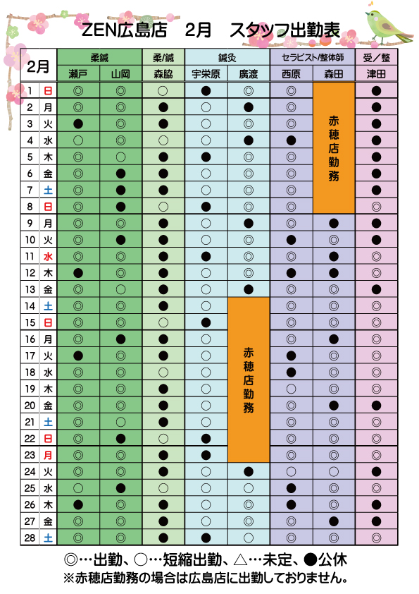 12月のスタッフ出勤状況もこちらからご覧になれます⇒12月のスタッフ出勤状況