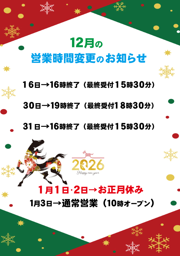 年末年始の営業時間のお知らせとなります。